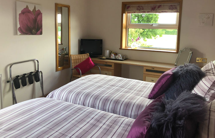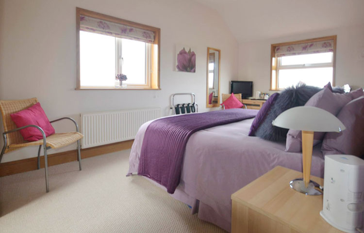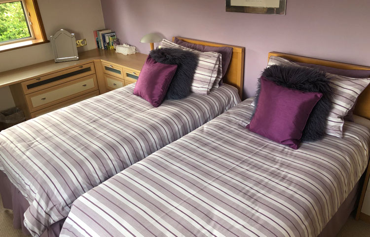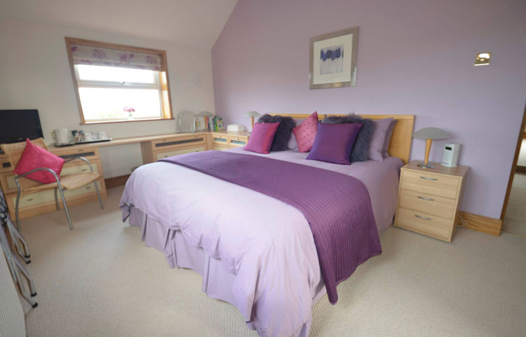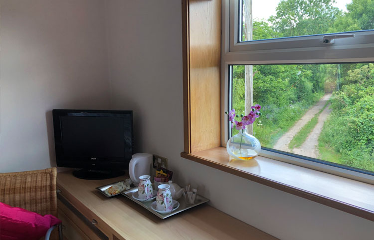 The colours used to style this room echo the sunsets we enjoy on a lovely evening viewed from the double aspect windows. They are aubergines, mauves, and purples with an accent of cerise. We can convert to twin bedded layout*. The oak framed windows and doors enhance the natural feel of the colour scheme. There is plenty of storage in the fitted furniture and also two mirrors. A range of teas and coffees is to be found on the hospitality tray and hot chocolate too. Biscuits too are supplied with dunking in mind! Just ask if you need fresh milk, which we supply in a Thermos jug to keep it fresh.